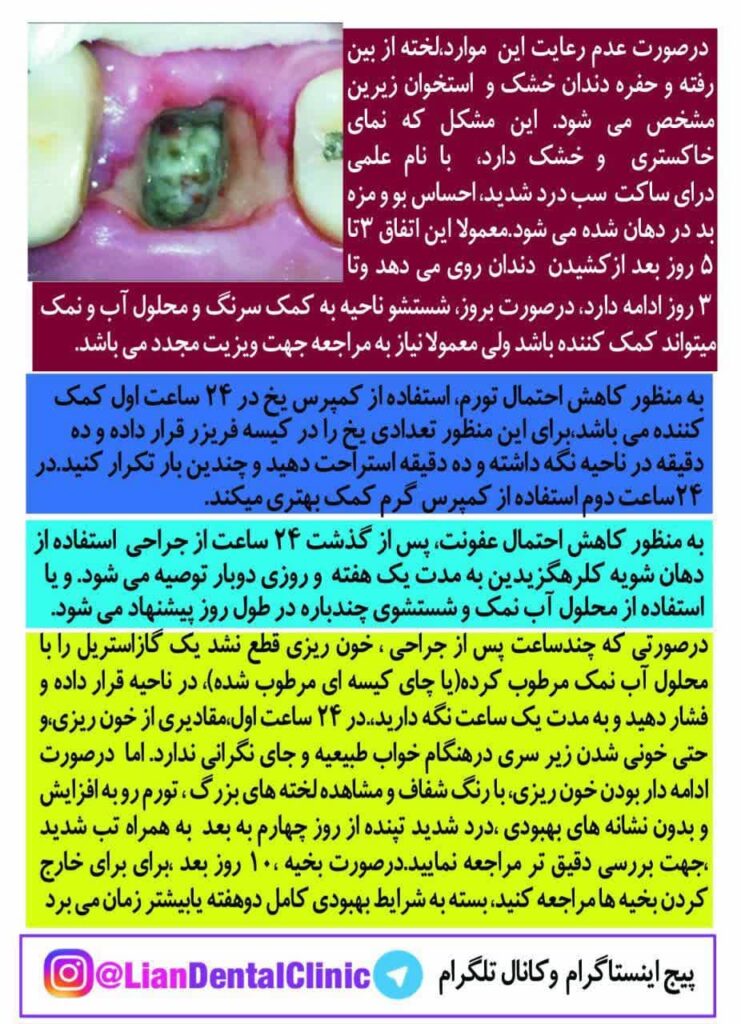 در حفره دندان کشیده شده، لخته خونی تشکیل می‌شود که حفظ آن برای ترمیم استخوان و کاهش درد بسیار حیاتی است.