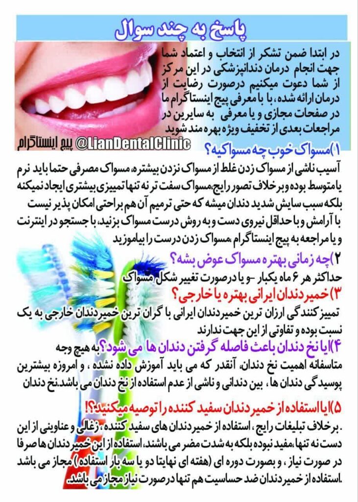 - نحوه مسواک زدن: با آرامش و با حداقل فشار دست، و با روش صحیح مسواک بزنید. برای یادگیری روش درست، میتوانید به منابع معتبر در اینترنت یا پیجهای آموزشی مراجعه کنید.